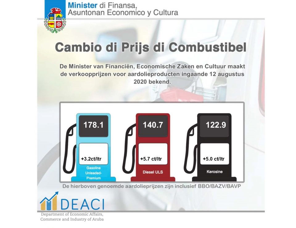 Minister di Finansas, Asuntonan Economico y Cultura ta anuncia e prijsnan nobo di benta di combustibel entrante 12 di augustus 2020: