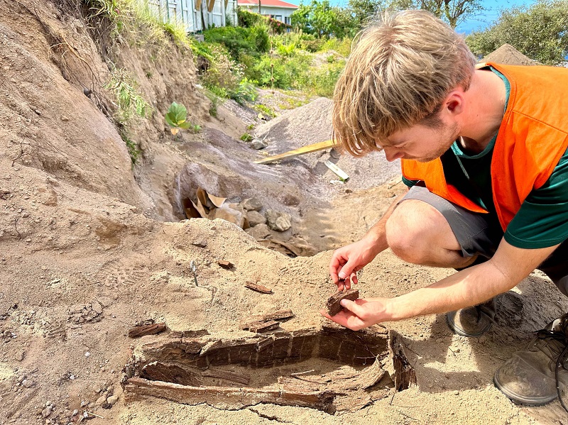 A week ago, the archaeologists started excavations, with the help of local excavator operator Lincoln Hassell who has been doing precise work in order not to damage the artefacts on the site. A place of interest on the site is the trash pile behind an old wall, where the people used to throw their trash. In the underneath layers, the archaeologists have been finding mostly historical artefacts and a lot of 19th and 20th century material.