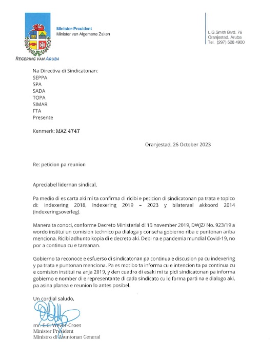 Mientrastanto, Prome Minister a invita sindicatonan pa un reunion pa mira kico ta e problema di traha den comision y lo aclarea esaki durante di reunion. Importante ta, Prome Minister a enfatisa, cu como doño di trabou, Gobierno ta carga su responsabilidad y kier haci esaki en conhunto cu Sindicatonan. Gobierno di Aruba ta spera cu sindicatonan bin na mesa pa papia tocante indexering y con pa regla esaki una bes por todas pa asina tin trankilidad y siguridad pa tur trahado den e aparato gubernamental.